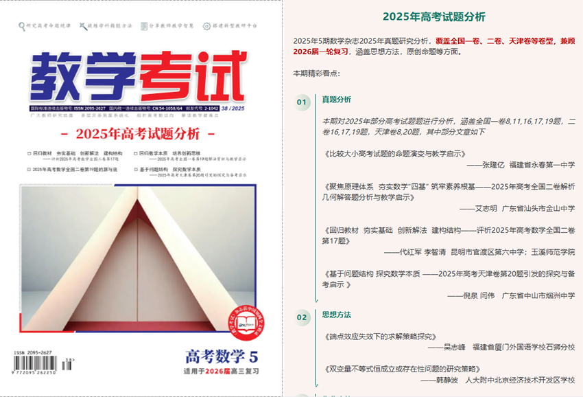 《教學(xué)考試》雜志是公開發(fā)行的省級教育期刊,國內(nèi)統(tǒng)一連續(xù)出版物號CN 54-1058/G4,國際標(biāo)準(zhǔn)連續(xù)出版物號ISSN 2095-2627,已被中國知網(wǎng)收錄。自創(chuàng)刊以來,雜志影響力持續(xù)提升,在全國中學(xué)師生中樹立了良好口碑,被譽為“良師益友”,并被眾多學(xué)校圖書館列為館藏期刊,發(fā)行范圍覆蓋國內(nèi)外,是中高考教學(xué)領(lǐng)域的重要參考讀物。