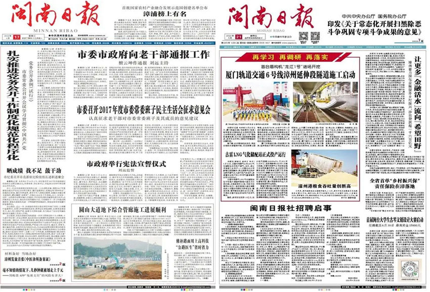 《閩南日報(bào)》堅(jiān)持黨性,面向讀者,突出地方特色。A版以社會(huì)、經(jīng)濟(jì)新聞為主要內(nèi)容,體現(xiàn)性、時(shí)效性,讓您一報(bào)在手,盡曉漳州動(dòng)態(tài),了解天下大事。B版致力于可讀性、知識性,追求品味,努力滿足不同讀者的閱讀需要,更加貼近生活。2005年,閩南日報(bào)將按照“三貼近”的要求再次改版,提高新聞比重,調(diào)整版面定位,整合新聞資源,充分體現(xiàn)“新聞紙”的基本要求,新版閩南日報(bào)將以新的內(nèi)容、新的版面、新的實(shí)踐、新的服務(wù)展現(xiàn)在您的面前?!堕}南日報(bào)》印刷設(shè)備先進(jìn),技術(shù),力量雄厚,連續(xù)多年獲得全省報(bào)紙印刷質(zhì)量評比品質(zhì)獎(jiǎng)。